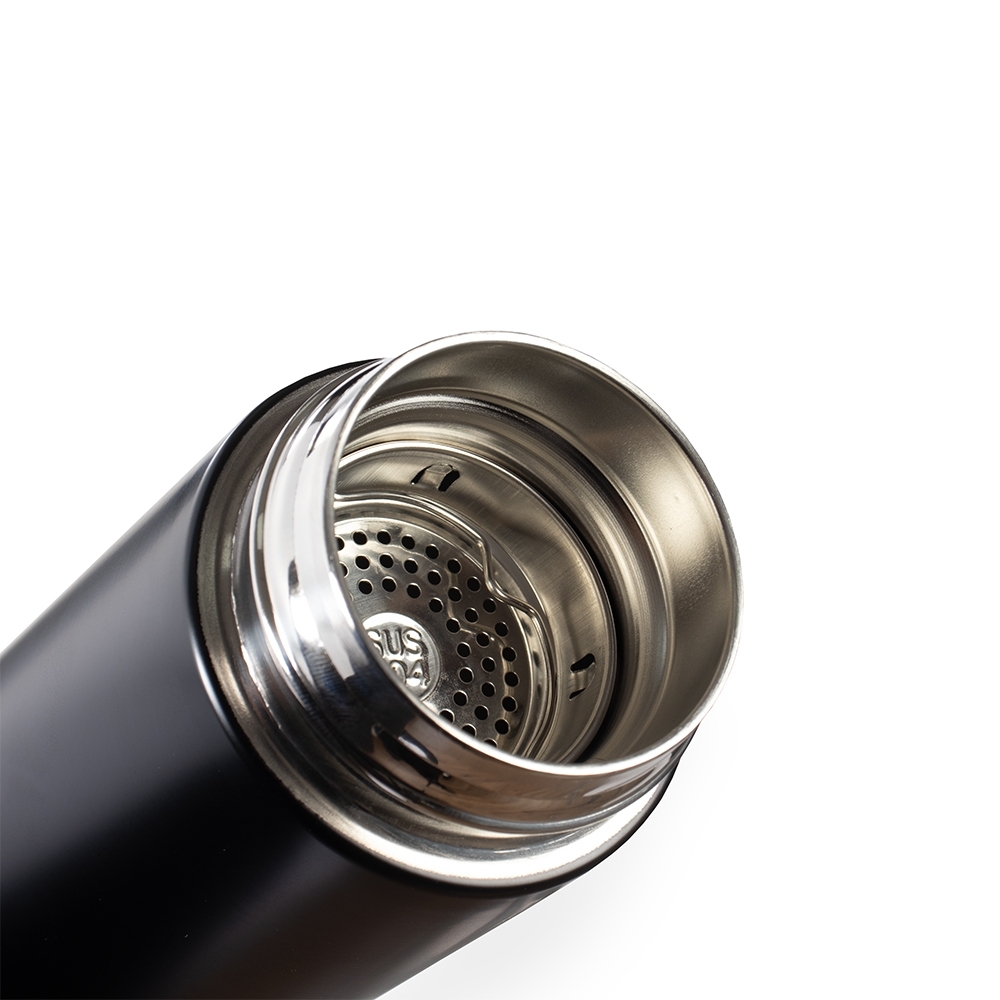 Garrafa térmica de parede dupla, com parte externa em inox 201 e pintura aplicada por spray, e camada interna em inox 304. Possui capacidade de até 400ml, tampa rosqueável com parte interna em polipropileno (PP) e anel de vedação emborrachado, além de base antiderrapante em PP. Acompanha cesto infusor com alça em inox 304.
